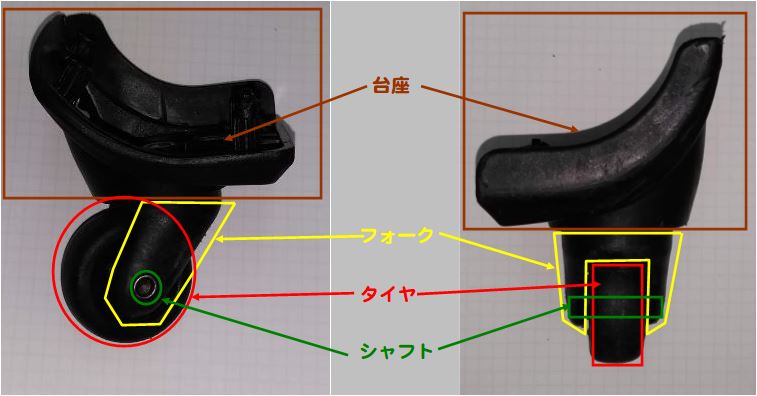 4キャスタタイプの場合、タイヤの車軸を支えて方向を変える部分をフォークと呼びます。