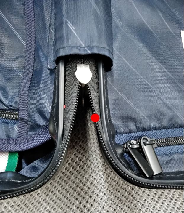 スーツケースを開くとき、赤●あたりでスライダーを留めて開く
